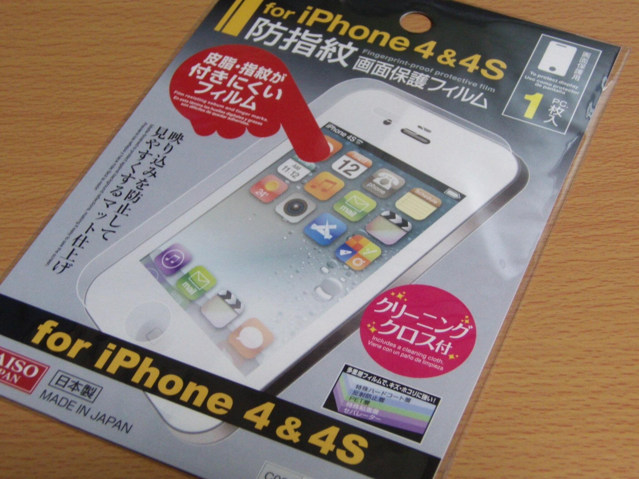 ダイソーのiPhone 4&4S 防指紋 画面保護フィルムなのですが、マット仕上げで指紋が付きにくいタイプです。