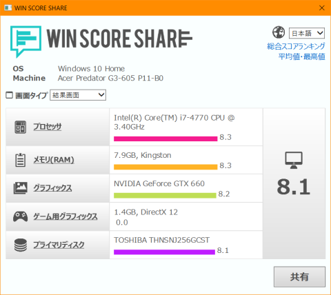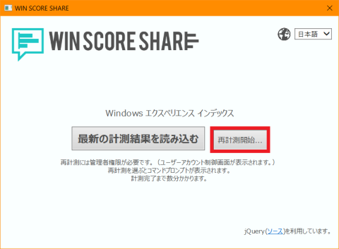 Windows 8.1以降、システムのパフォーマンスを比較するための指標とし利用出来る“WEI”のスコアが、コンピューターのプロパティ画面から削除されていました。