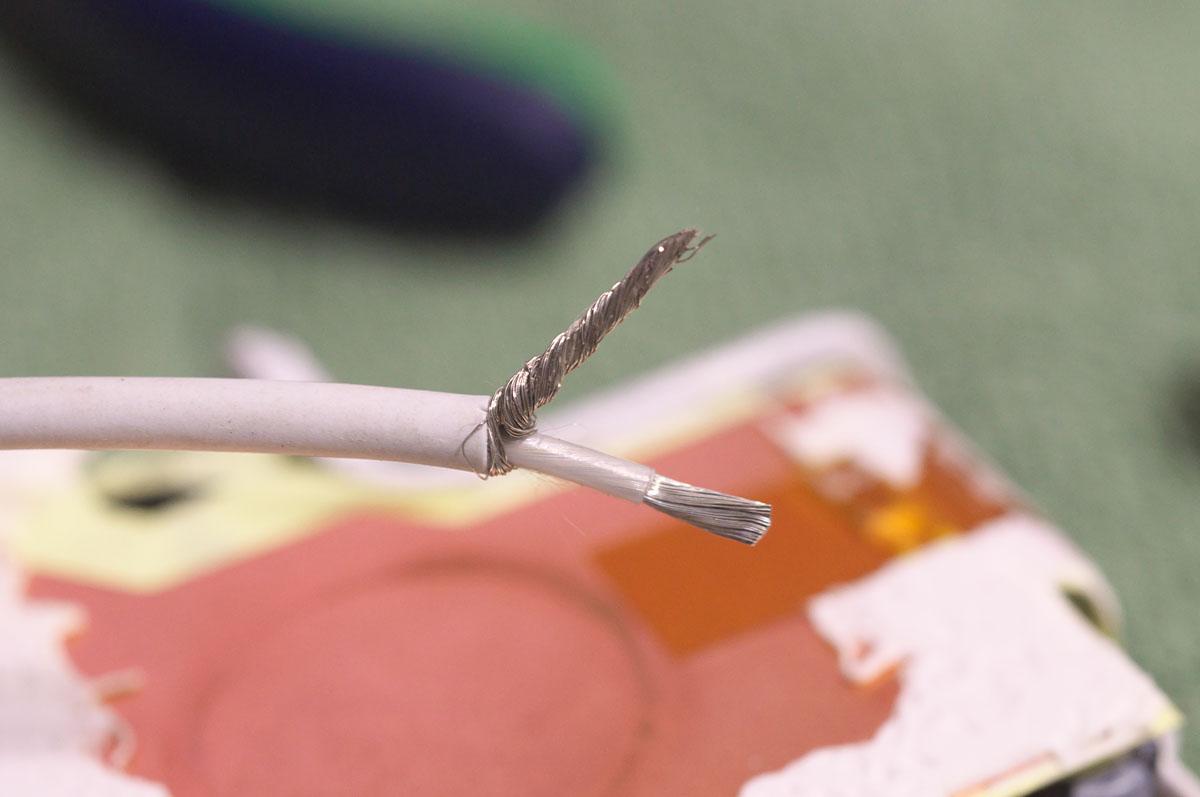 最初に、ケーブルの被膜をむき、半田付けしやすいようにあらかじめハンダを流しておきます。