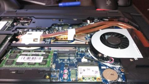 左上がSSD、左下にHDD、中央下部にメモリー、右下に無線LANユニットとminiPCI-E空きスロットとなっています。