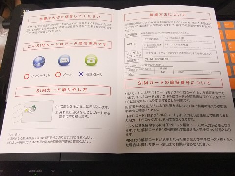 接続設定を行う際に入力する値やSIMの取り外し方・SIMの暗証番号などが記載されています。