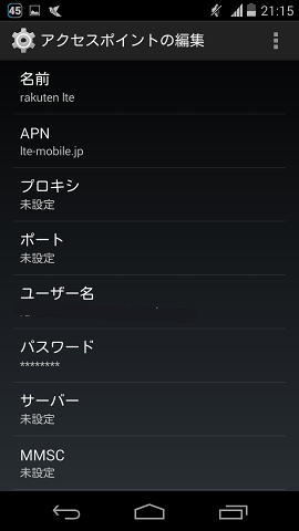 そこは注意が必要です。今回のNexus 5はLTE端末なので、LTE用のAPNを入力して