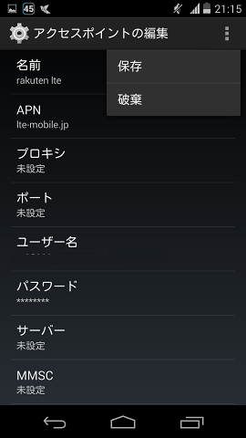 右上のドットが3つ並んだメニューボタンを押して保存を選択しアクセスポイント名設定を