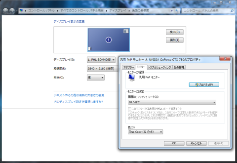 結果はPHILIPS BDM4065UC/11とGeforce GTX 780との組み合わせで4k 60Hz出力できました。安定性については未知数ですが1時間程度表示させた状態にしていますが特に問題ありません。いい感じです。