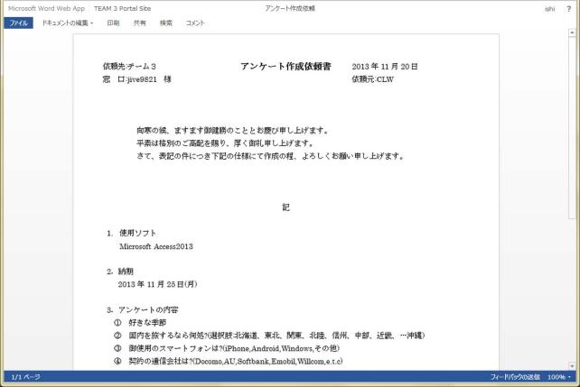 依頼主であるCLWさんが、アンケート作成依頼書をWordにて作成し、チームサイトにアップ。