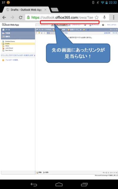 移動中の電車の中でNexus7にてOutlookを見ていたのですが、私の使用するWIMAXは街中以外とか、高速移動体の中だと通信が安定しなくて、メールを受信しても、通信できない状況だと返信ができず、書きかけメールの保存もできず、画面の遷移もできなくなり、その状態が長く続くとサインアウトさせられてしまいました。