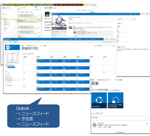 ・ニュースフィード上での意見の交換や、Lyncでの在席管理、SharePointでのデータや資料の共有