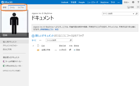 同じように「SkyDrive」のタブでは、左上にタブが表われます。