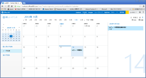 こちらもGoogleカレンダーなどと同様のものと思っていただければわかりやすいでしょうか。予定表はMicrosoftのサーバーソフトウェアとしては、電子メールと同様にExchange Serverが提供している機能であり、起動時にはメールの場合と同様に「Outlook Web Apps」と表示されます。