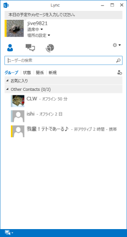Lync 2010では表示されなかった自分やメンバーのプロフィール画像が表示されていて、若干の違いがあることが判ります。