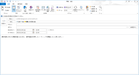 Lync会議を開催するためには、先に紹介した通りOutlookから予約する方法と、Lync Web Schedulerを利用する方法とがあります。今回はせっかくOffice 2013 Professional Plusを利用していますので、Outlookでの予約を試してみました。
