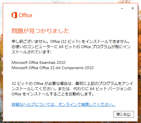 という2件の64ビットのOfficeプログラムが邪魔してインストールできないらしい。後者は32-bitと書いてあるのに64ビットなのか?よくわからないが私が使用しているOffice2010は64ビットの仕様だったらしい。プリインストールだから気にせず使っていたのか、初期に選択したのかはもう覚えていないがそうらしい。