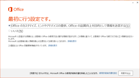 ここまでくれば一安心。まず最初の設定で、Microsoftへの情報提供をするかどうか。情報提供しても不利益はないだろうから「提供する」でOK。