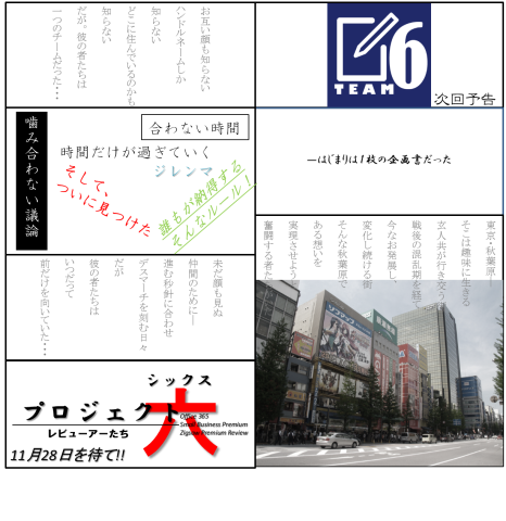 チーム3、6、5はそれぞれ並列で上下関係はなく3チームがそれぞれの企画力を生かした戦いになる。チーム内では管理者のチームリーダーが存在し、残り3人はヒラの構成員という立場になる。私の場合は4人中2名が初見のメンバーだったこともあり完全にヒラの立場である。