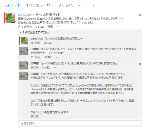 このときはチーム内で大きな進展がなかったため特に指示を出したり意見を述べたりはしなかった。空港で使う場面というのは、「搭乗の待ち時間」か「乗り換えの待ち時間」に限定されると思う。長時間あるわけではないのでできることは限られるが、進捗状況をチェックし、必要なファイルをダウンロードして飛行機に乗り込む。そんな使い方がいいのではないだろうか。その意味ではニュースフィードが有効活用できる。簡単なコメントも残せるし、現状報告もしやすかった。反対にLync会議などはよほど時間を合わせないと使いにくいのではないか。