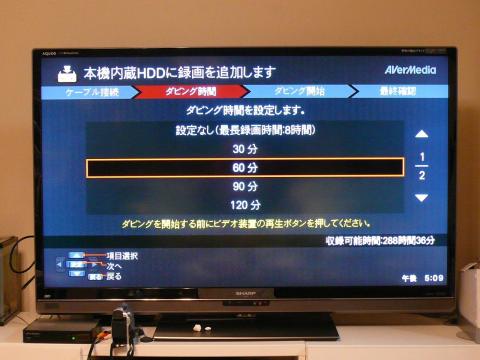 次の画面が録画時間の設定で、2で確認した時間を設定していれば、自動的にテープが終われば取り込みも完了するようになっているみたいです。