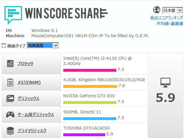 - グラフィックス : NVIDIA GeForce GTX650(1GB)