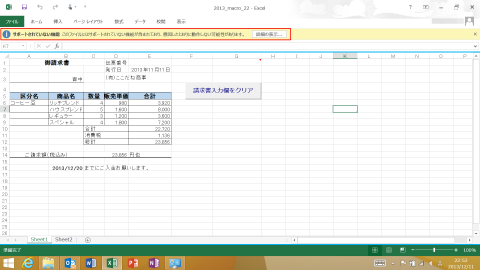 しかし、マクロの埋め込まれているExcelファイルは開くことは可能ですが、実行は不可。