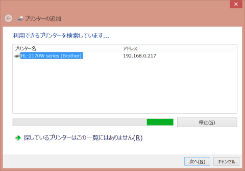「プリンターの追加」を実行すると、プリンターの型番である「HL-2170W series (Brother)」というプリンター名と、IPアドレスが検出されます。