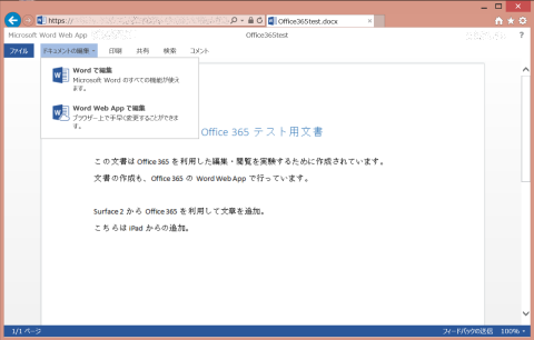 そこで今度はSurface 2に戻り、ローカルアプリでの編集を試します。閲覧状態であればWord Web Appの「ドキュメントの編集」メニューから、編集方法をローカル版のWordとWeb App