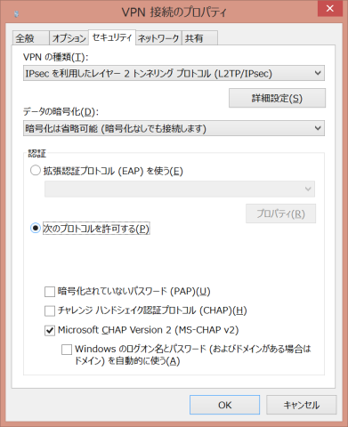 ここで作成されたVPN接続のプロパティを次のように変更します。