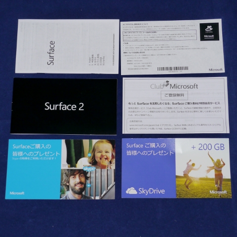 付属品(取説類):SkyDrive200GBが2年間無料使用出来るS/Nと、SkypeのS/Nが