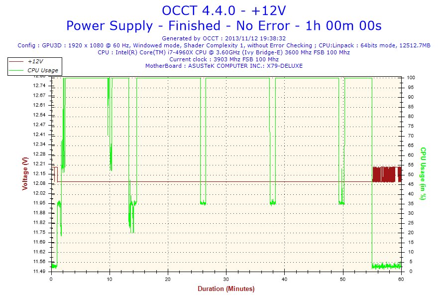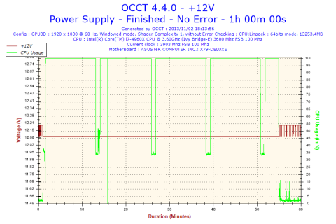 見方が間違っていたら申し訳ないですが、画像の赤い線が重要で、最初と最後以外はまっすぐに一定を保っています。もしかしたら、最大でも333W程度の消費電力だったので消費電力が少なかったからかもしれませんが、12Vを下回ったのが1度もありません!12Vを下回るとPCを安定して動作させられるとはいえないので、これはかなり重要な点です!