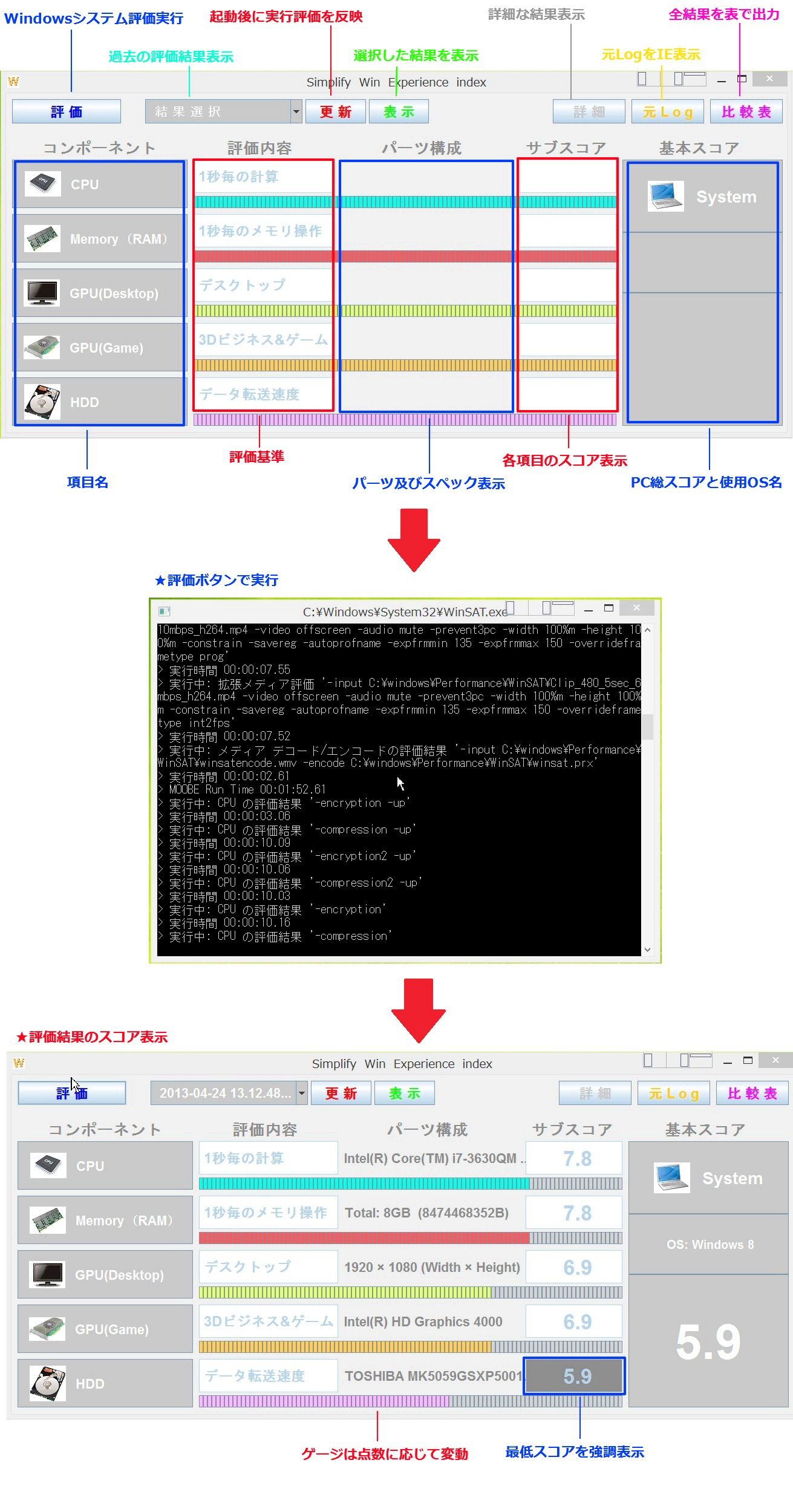 そこで、このアプリによりボタンで評価の実行、スコア・スペックなどの表示と