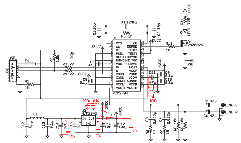 でるので、PCM2704の入力端子(28ピン)に繋ぐだけで