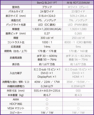 そして、今回の製品で最も重要なスペックは「フリッカーフリー」という部分でしょう。下のスペック表には載っていませんが、本製品は「フリッカーを効果的に取り除いたLEDバックライトを採用し、従来品はフリッカーが発生するLEDバックライトを採用している」ということで、その効果のほどが気になるところですが、それは次の項目で改めて紹介したいと思います。