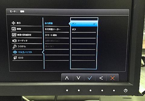 部屋の照明が十分明るい時は、輝度が最大になるようになっています。私が使用している環境では照明が十分に明るいようで輝度が最高になってしまい明る過ぎて目が疲れます。「標準」設定では輝度調整が適用されないので、「ユーザー」設定で輝度を落とすと、今度は本機能が適用できません。