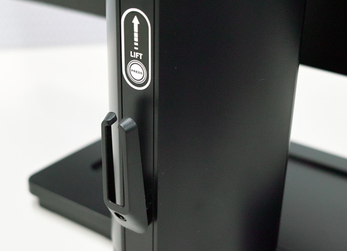 取扱説明書にも書かれていますが、高さ調整で最も下げた状態から高くする場合は、背面側アーム部の「高さ調節用つまみ」を押してロックを解除します。ただし、押しただけではロックが外れないことが多いので、本体を上から下に押し下げながら高さ調節用つまみを押すと簡単に操作できます。