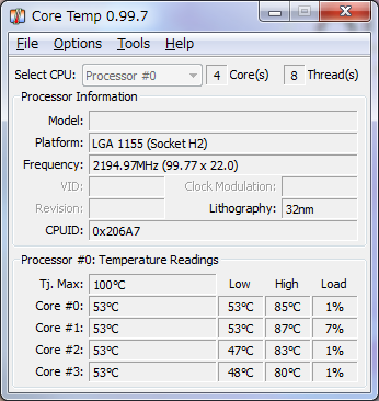#1コアが87℃を記録しています。電源が落ちる最高温度が100℃なので、そこ