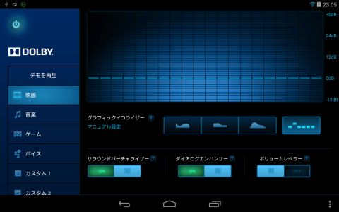 横置き時にフロント下部にステレオになるようにDolby Digital Plus対応スピーカーがレイアウトされています。専用アプリで音質を調整可能です。