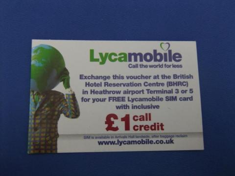 Lyca mobileのSIM交換券 通話クレジットは1ポンドなので微々たるものではある