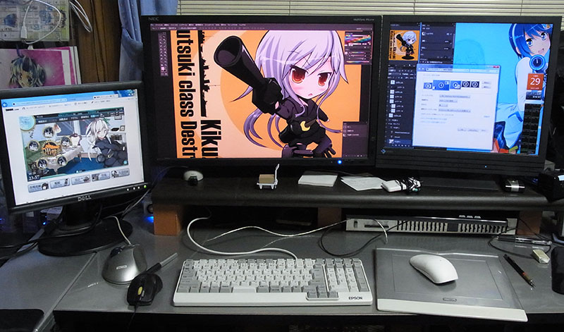 最後の写真の通り、中央に24インチ1920*1200を配置してしまっているので、サブモニタもそれなりの解像度がほしいのですが、机の幅が24+19インチがピッタリサイズかつ19インチSXGAは手軽に入手できるんでそれで落ち着いています。