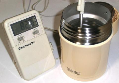 お湯を入れて測ってみたら、82.7℃だった。そのままふたを閉めた。約6時間後に測ってみたところ、47℃だった。