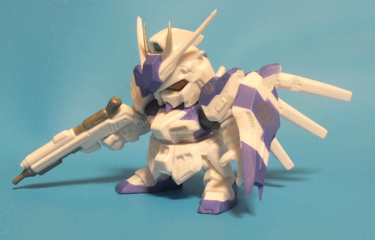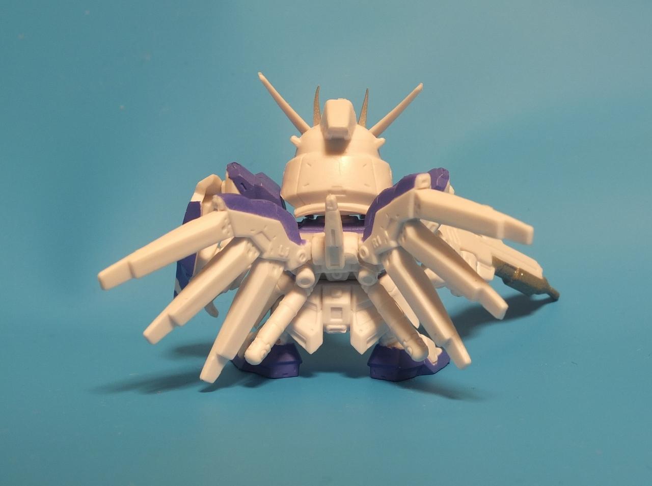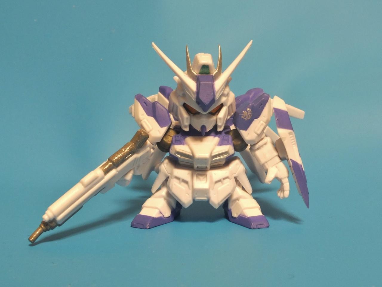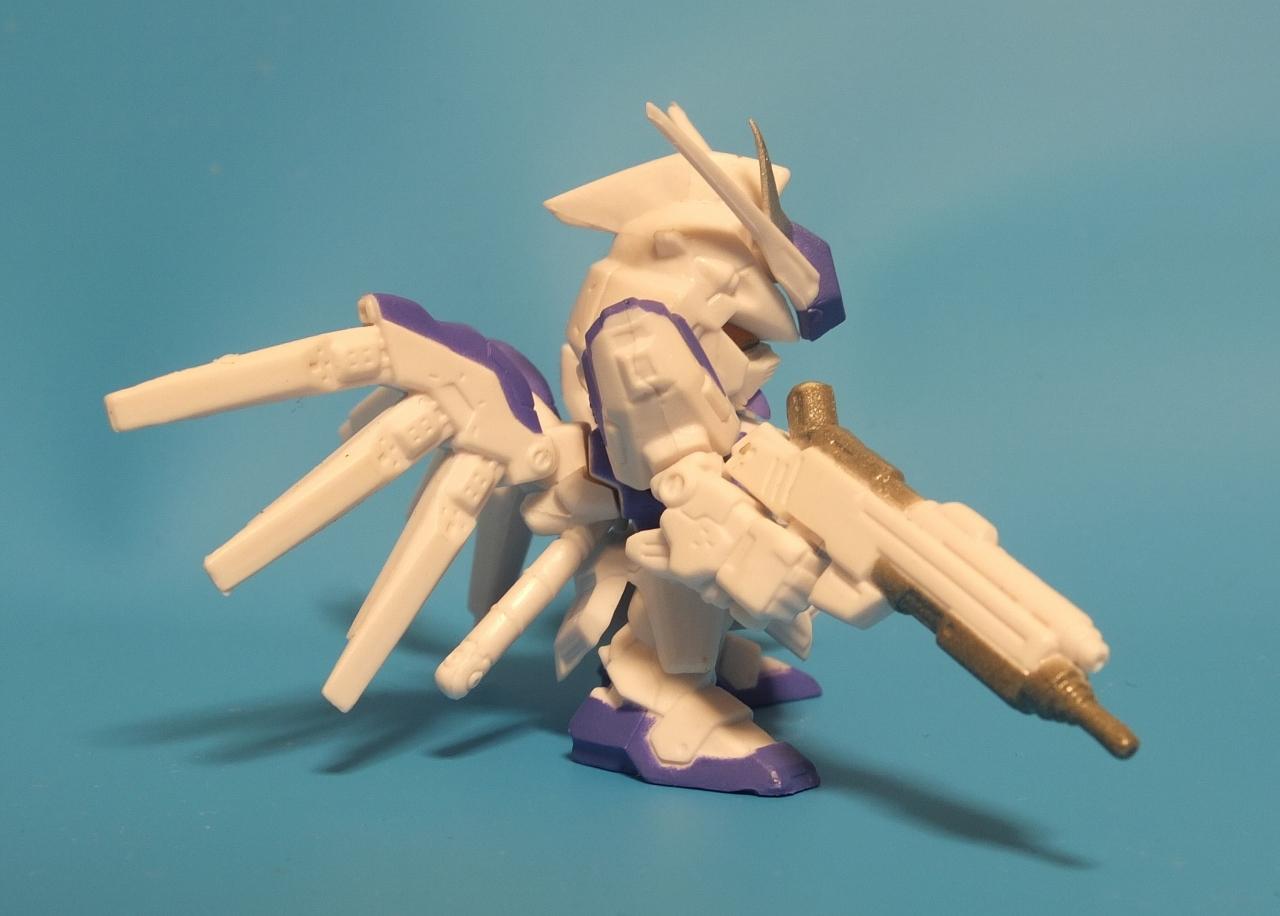 ファンネル6個とビームライフル、シールドと普通のνガンダムと同じ武装ですが紫のカラーと黄色い目が特殊な感じです。