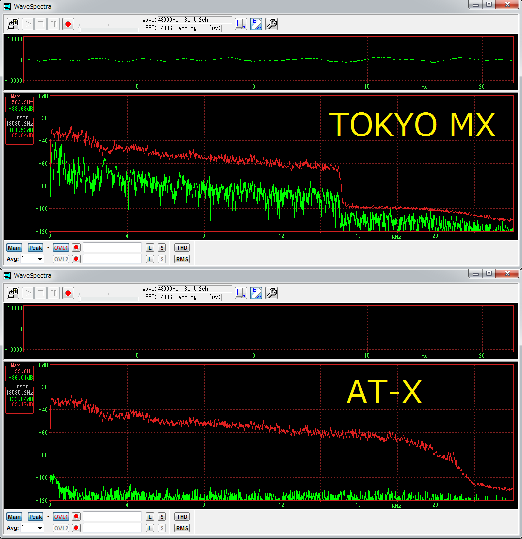 例えば(100度CSの)AT-Xはハイカットなしで放送していますが、MXだと20kHzまでしか出てないとか、テレ東だと15kHzまでしか出ていないとかよくある話です。