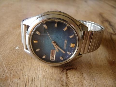 傷も多いですが、カットガラスの奥の文字盤が青く輝いていて、なかなかステキです。8振動のELNIXと違って、「カチカチ」がユッタリしています。