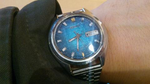 傷はあるとはいえ、せっかくのカットガラスと、青のムラムラ模様の綺麗な文字盤だから、そのうち他の外観がひどい動作品を探してムーブメントを入れ替えようかしら…