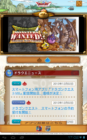 Androidタブレット TM105AでドラゴンクエストIをプレイしてみました。正常に動作するようです。ファミコン版と所々違う感じがしますね。何版を元にしてるのかわかりませんが、どちらにしてもしょぼいので、ファミコン版をそのままな感じでカニ歩きとかの方がよかったんじゃないかなwAndroidタブレット TM105Aでドラゴンクエストモンスターズ WANTED!をプレイしてみました。正常に動作するようです。行動するためのアイテムが1時間毎に1増えるようなので空き時間に少しづつやる感じのゲームのようですね。