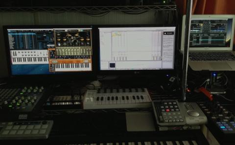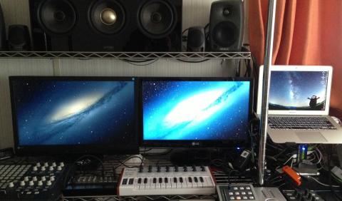 DAWソフト ableton live9を中心のディスプレイに起動させ、左右のディスプレイにはプラグインソフトシンセサイザーなどを起動させて配置、同時にDAWとプラグインを見渡す事が出来るので、利便性がアップ