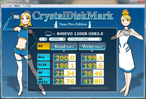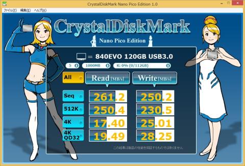 こちらのSSDを使って、CristalDiskMarkを走らせてみました。