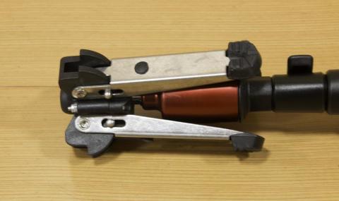 足元の三脚は跳ね上げて格納できるようになっており、開いた時は横のストッパーでしっかり固定されます。