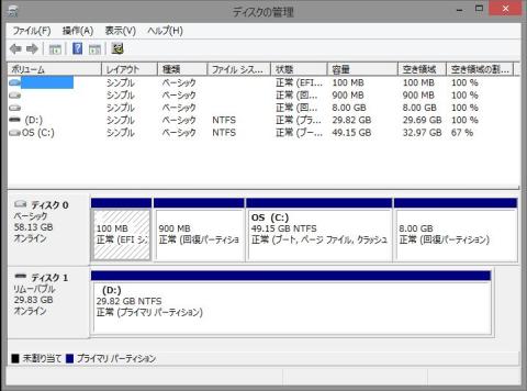 というのも回復パーティションに割り当てられている領域があるので、Cドライブとして使える量量が 50GB弱しかありません。