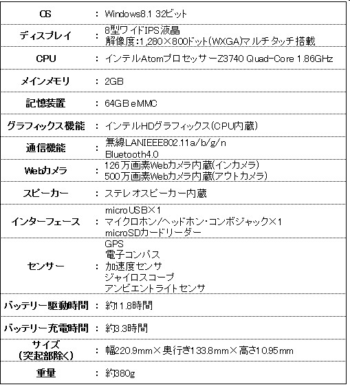 年末に出た Winタブ8インチと比べ駆動時間が伸びデジタイザが付いたくらいのイメージでしょうか。