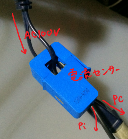 (電源100V線にクランプ式電流センサー→RaspberryPiでA/D変換演算して電流値を得る→Wを求める)