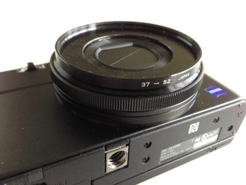 手持ちの37-52mmのステップアップリングの、37mm側オスネジの部分を切り取り、フラットな状態にした上で、RX100M2のレンズ前面に両面テープで固定する。