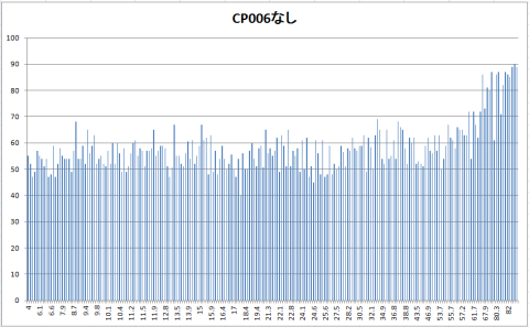 ガンガン負荷を掛けると、両環境とも90度位まで行きますが、CP006があると3~4度下がるようです、CP006ありの場合は負荷を若干高めに掛けてあるのですが温度は低くなっています。